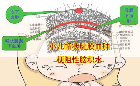 外伤后出血聚集在帽状腱膜下腔的头皮血肿,特点为血肿弥散,可波及整个头颅,张力不高,疼痛较轻,触诊时有明显波动感,小儿出血量大时可造成休克。