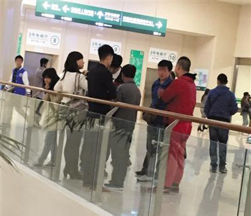 10月20日下午,“血头”(穿红衣男子)带着几名卖血者聚集在医院门诊大厅。