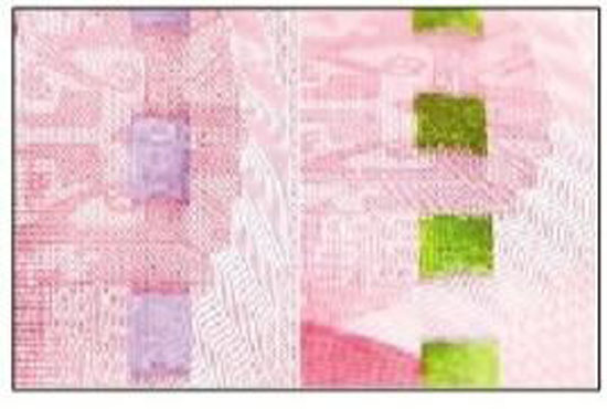 垂直票面观察,数字以金色为主;平视观察,数字以绿色为主。随着观察角度的改变,数字颜色在金色和绿色之间变化,并可见一条光带上下滚动。